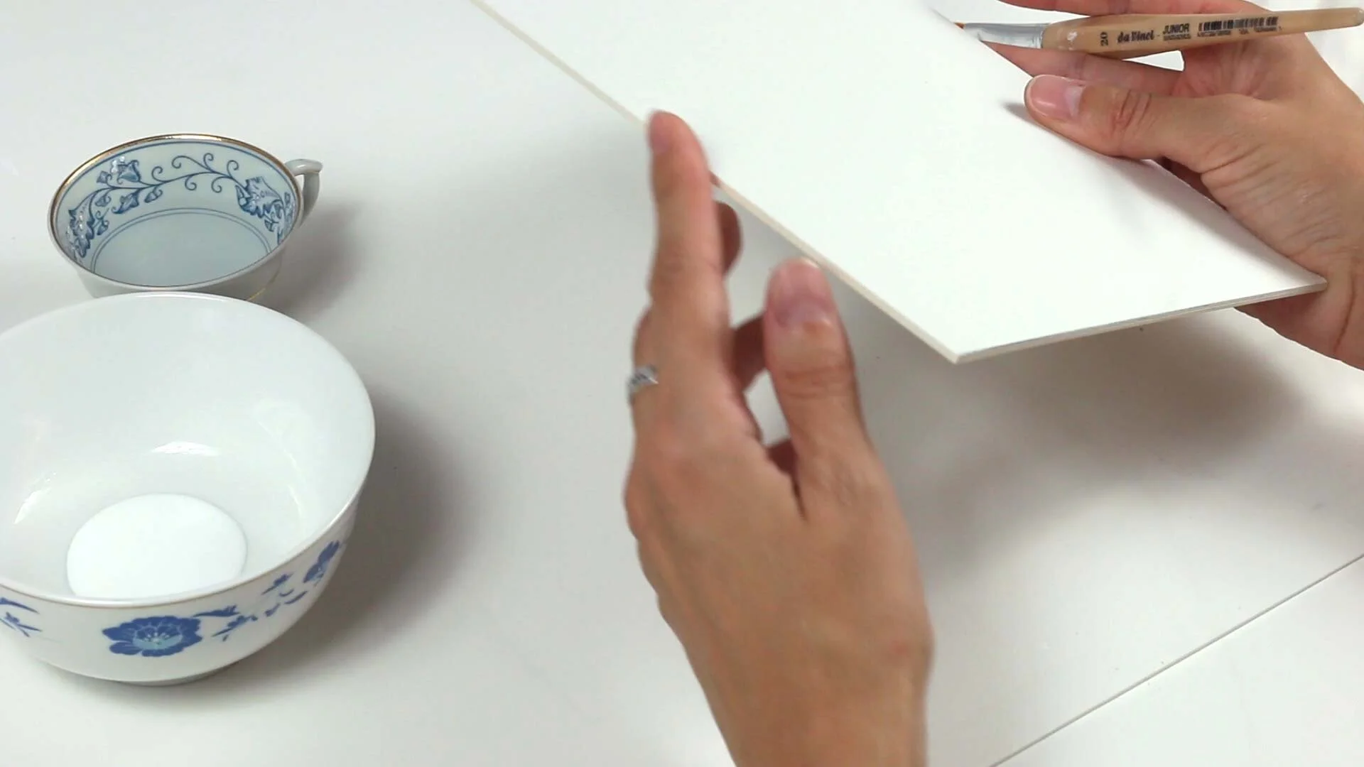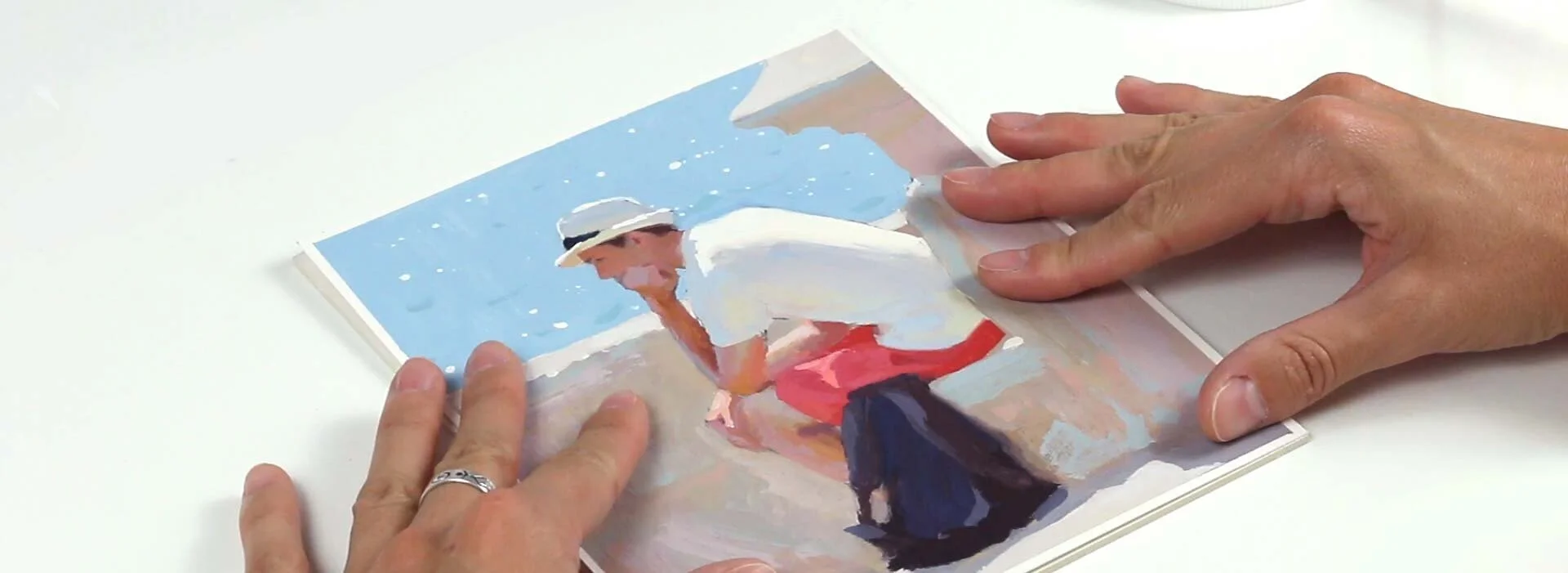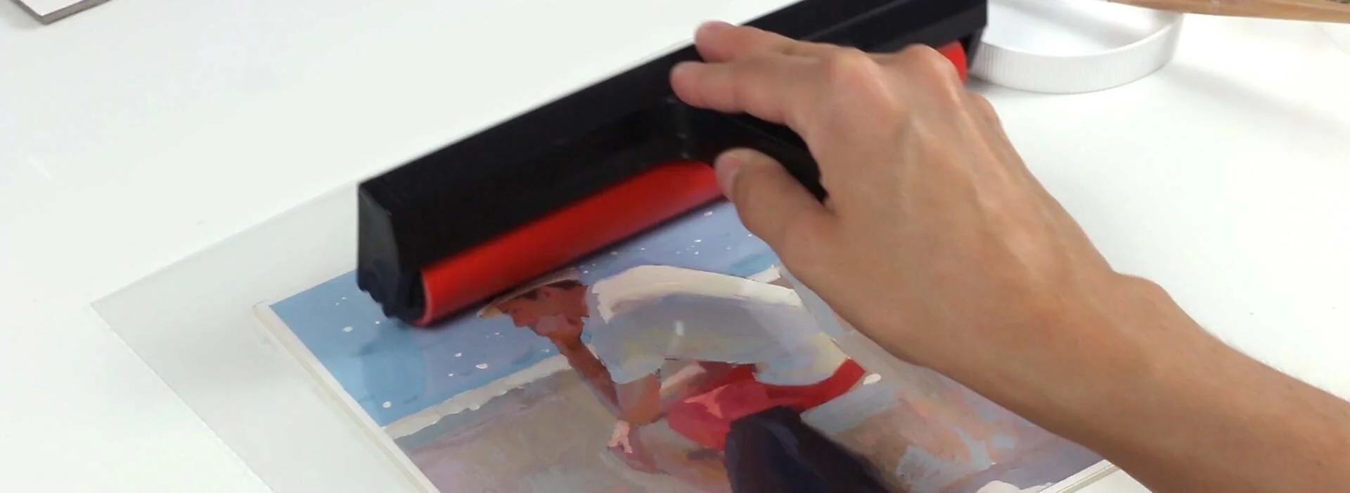 Now, take a plastic sleeve or tracing paper, put it on top of the painting and press your fingers gently against the paper. You can also use a brayer to apply even pressure to the surface of the painting. This process prevents air bubbles from forming between the painting and the support.