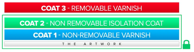 Then, when the varnish has dried, you need to apply an isolation coat to it (coat #2, non-removable). An isolation coat is a non-yellowing, non-removable, clear acrylic medium that permanently seals the surface of the painting and provides a protective barrier for varnish application and removal.