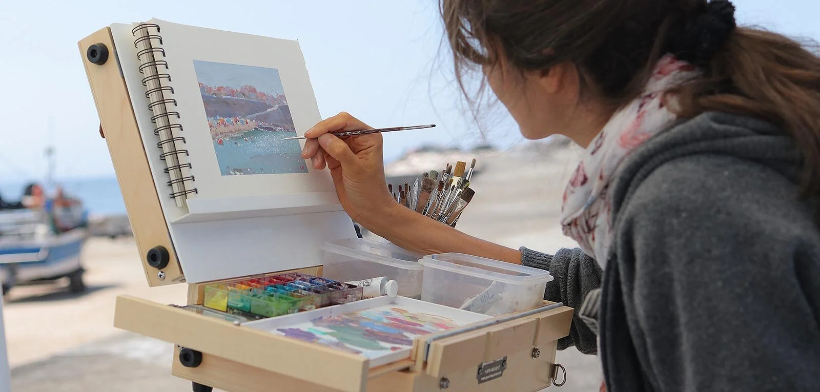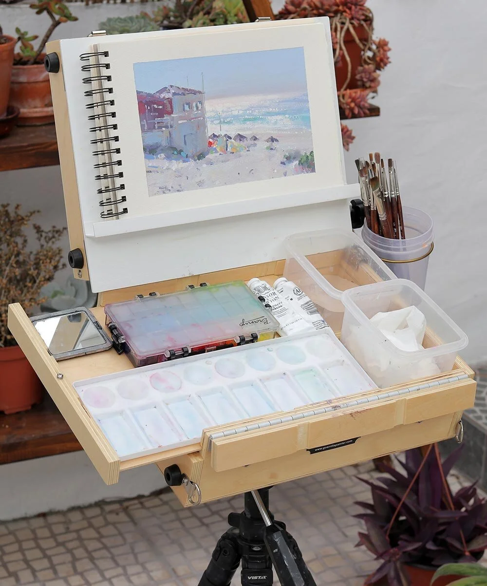 These pochade boxes are great and relatively cheap when compared with other plein air easels on the market, but in the end they are just boxes with lids. If you enjoy making stuff, you can build a very similar box by yourself. There are lots of videos on YouTube that show you how to build your own pochade box. You can even get an empty cigar box on Ebay and use it as your plein air easel. The lack of professional equipment shouldn't hold you back from going to paint outdoors. Before I came up with the solution for plein air painting with gouache, I had done many gouache paintings while sitting on grass or sand with my legs crossed and my sketchbook lying on the ground.