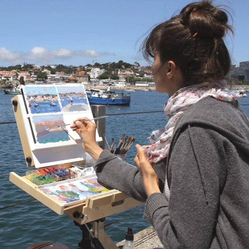 In this photo, I am using the same box without the tripod. I am sitting under a cream beach umbrella which creates perfect conditions for painting outdoors because it defuses the sunlight and makes it easier to judge the colors. Be aware that colored umbrellas cast colorful shadows, which might affect your color perception. White or cream umbrellas are perfect for painting on a sunny day.