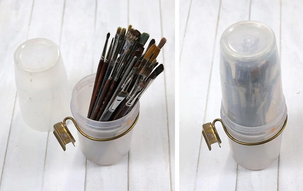 I made this brush case using two plastic cups, one of which had to be cut to fit into the other. This case protects my brushes while traveling.