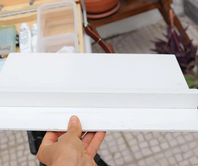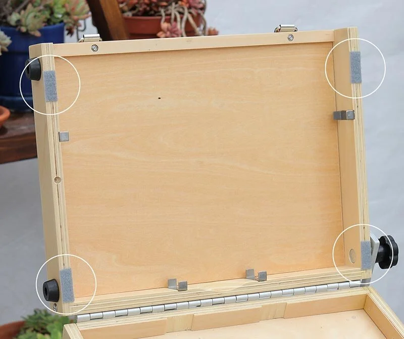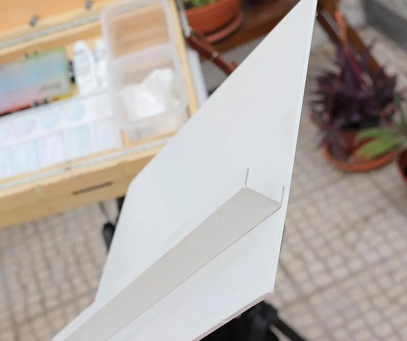 The white support which holds my watercolor pad in the photo is what my husband has made for me by gluing two pieces of plastic together. You can make something like this by yourself. I attach it to the box using velcro. It is very stable and I like that it lifts my watercolor pad a bit from the mixing area.