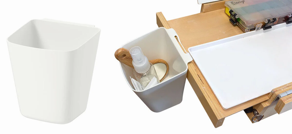You could use an Ikea storage unit called Sunnersta for storing your brushes. This cup attaches easily to Guerilla boxes and is perfect for storing short handle brushes