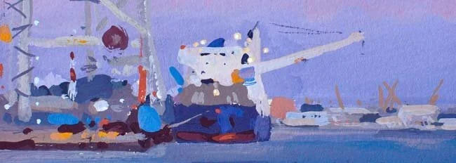 There are no bold brushstrokes here, except for the lights on the ship. The washed and translucent colors suggest that night is approaching.