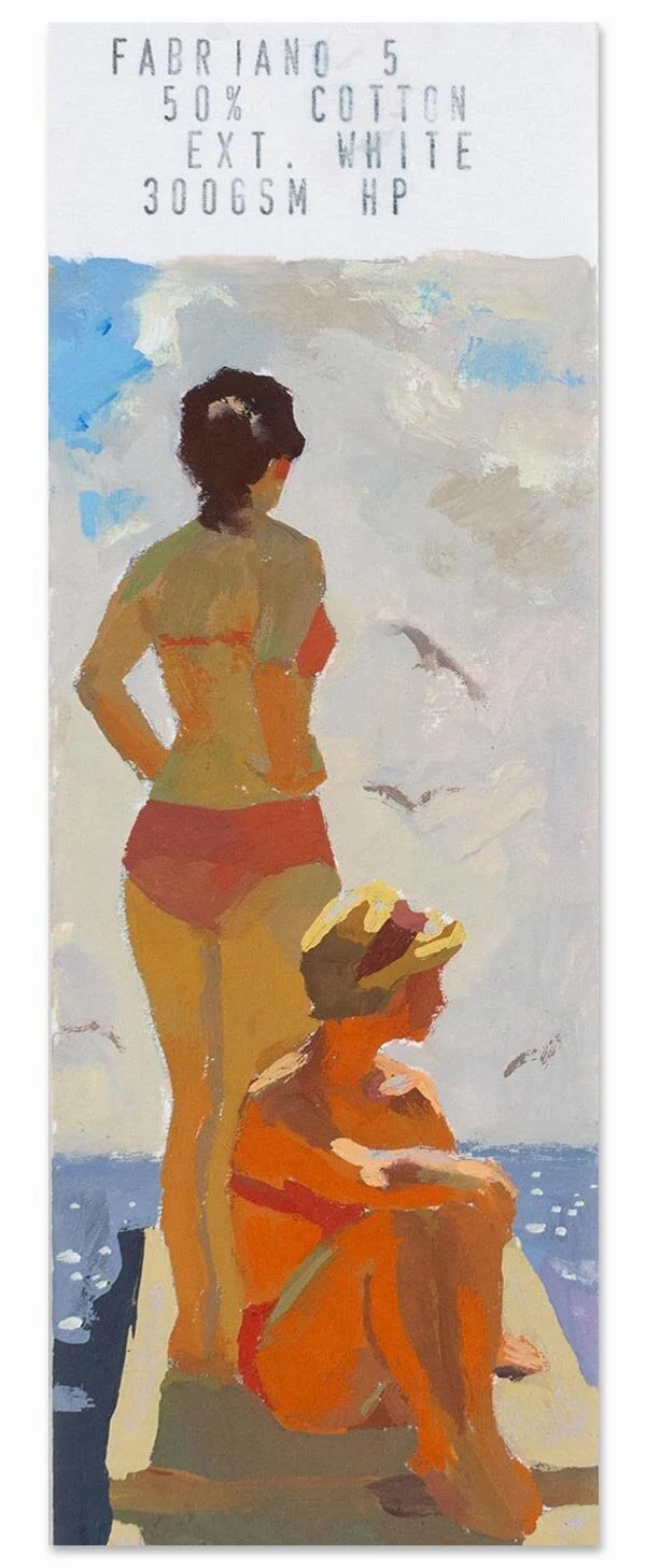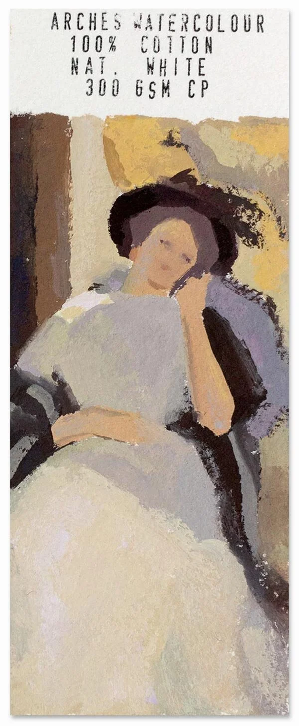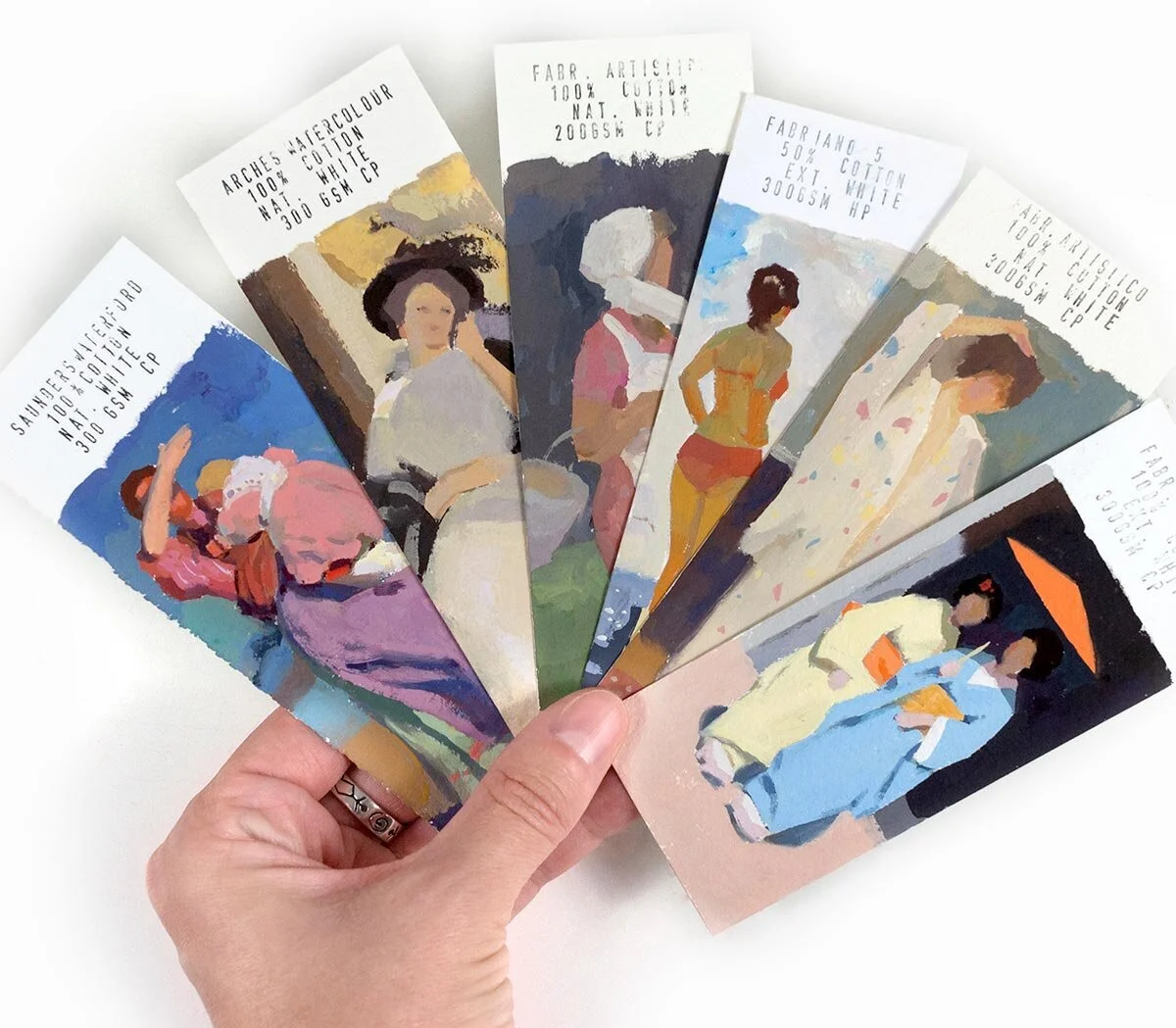I got these samples of different watercolor papers from “Koval” who make beautiful sketchbooks for watercolor and gouache, and I decided to test these papers with gouache, my favorite painting medium. First, I thought I would just make a few brushstrokes on each of these strips, using gouache, but then I decided to use the strips to do tiny master copies of the paintings of some of the artists I admired. It was such a fun task!