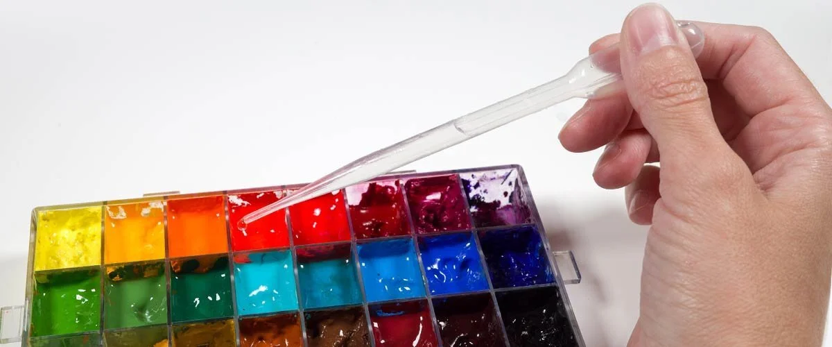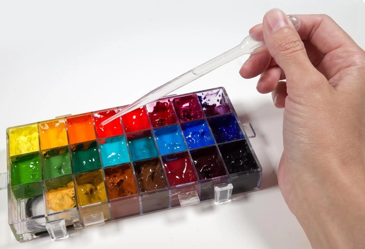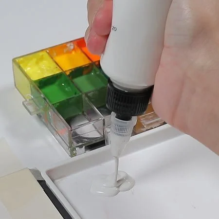 To add the medium to the paints in your storage palette you can either use a single dropper or you can pour the medium into a dropper bottle.
