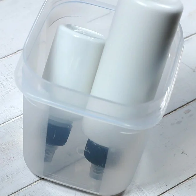 Storing these bottles upside down makes it easier to squeeze the paint onto the mixing tray.