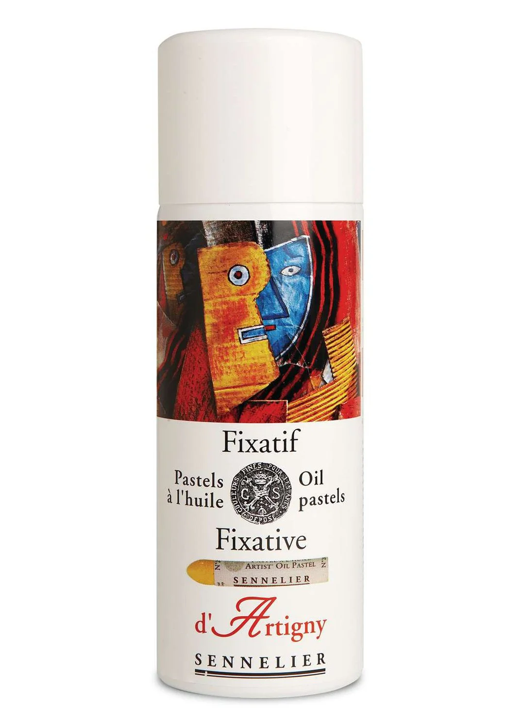 The only fixative for oil pastels I have experimented with is Sennelier D'Artigny Pastel Fixative. It makes oil pastel paintings completely dry to the touch and provides protection against dust and smudging. The application process involves five light coats, allowing each coat to dry for a minimum of 30 minutes. It's essential to apply this fixative outdoors.