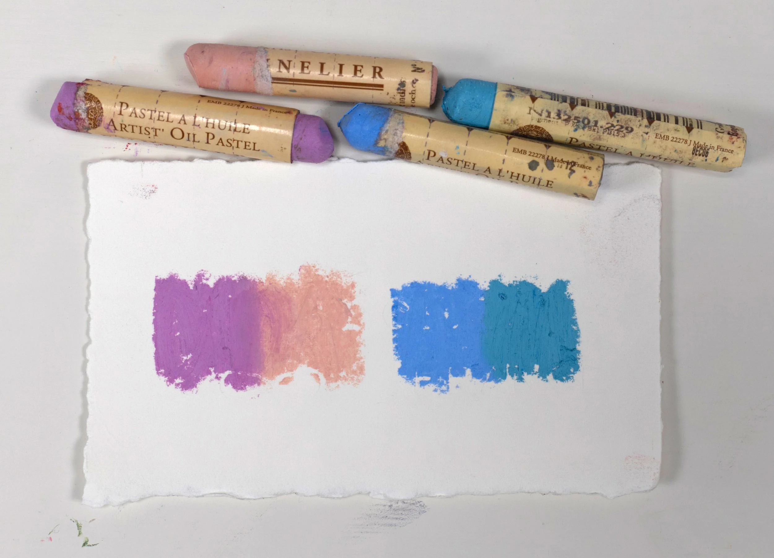 Any hot-pressed or cold-pressed, heavy-weight watercolor paper is suitable for oil pastels. Paper made of 100% cotton is ideal as it absorbs oil more effectively. While some tooth in the paper is beneficial for layering, excessive tooth can make achieving even color transitions in the initial block-ins more challenging. I typically use my fingers and blending stumps to work the colors into the paper. Once the large shapes are filled in with solid colors, layering becomes easier, and the paper's tooth becomes an advantage.