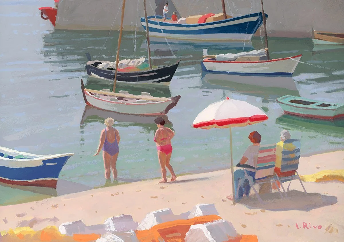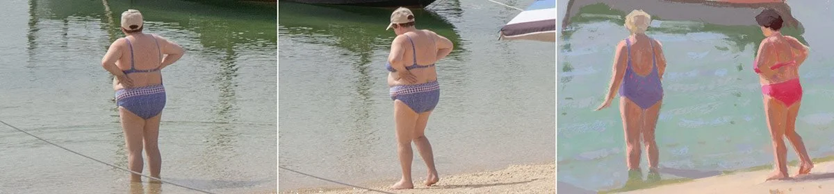 Besides the two people sitting under the umbrella on that beach, there was a woman moving towards the water. I took two photos of her in different positions and then I used them to create two slightly different female figures in the painting: one woman standing in the water and the other going to join her. To make those two women look a bit different I changed the position of the arms of the woman standing in the water and the color of her hair. One of my ladies is wearing a swimsuit and the other a bikini.