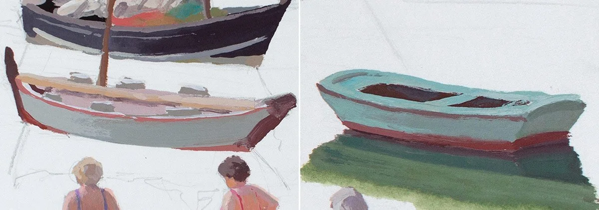 I also changed the colors of two of the boats because I didn’t want to have a black boat in the center of the composition. I made the dark brown boat in the center of the photo reference white and I made the old boat with the worn down paint at the right turquoise green, again, just to add more saturated colors to the painting in which neutral colors dominated.