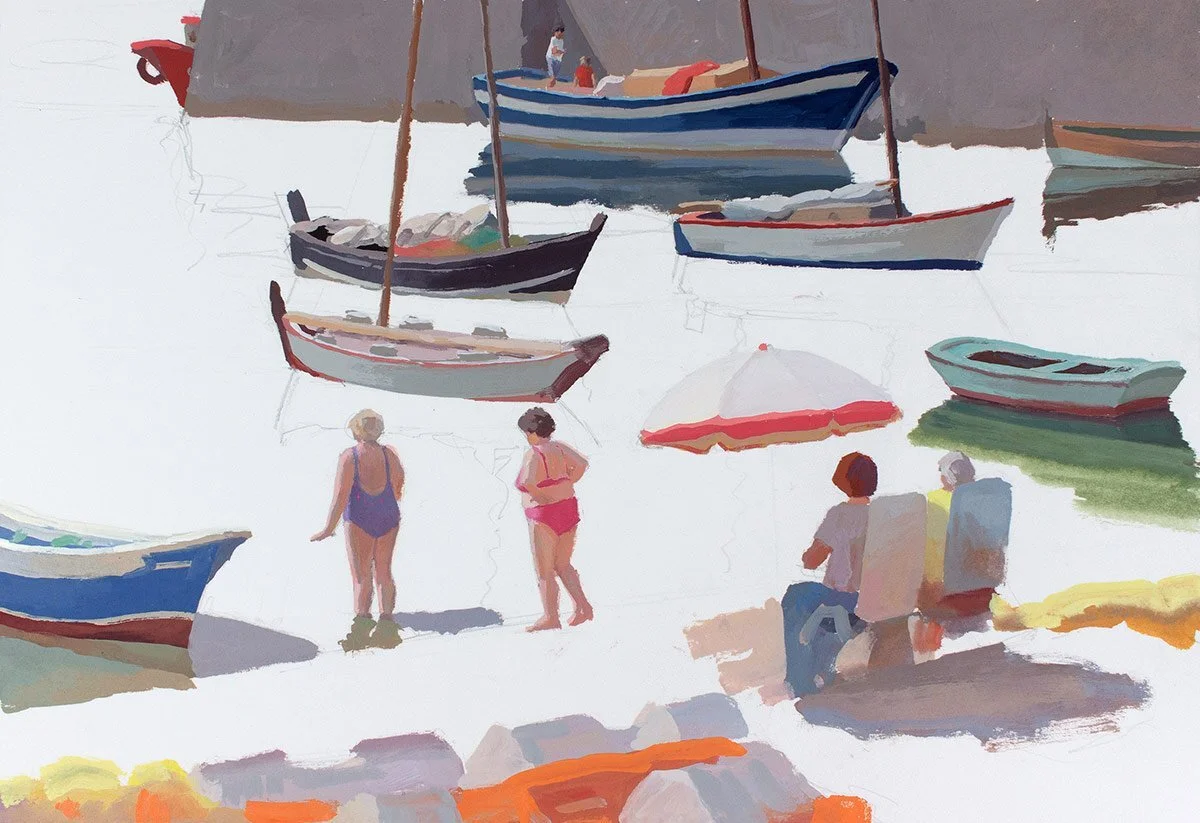 As you can see, the photo reference shows much more of the landscape than my painting. When thinking about the composition for this painting I had to ask myself what I liked most about the scene. What made me want to paint it? And the answer was - the boats and their reflections that showed how calm the water was, and also the woman walking towards the water to wet her feet (the water is usually freezing on this coast all year round, but because of that it is also clean and transparent). Therefore I decided not to include the sky in the composition and instead, give the entire paper space to the boats and the figures on the beach.