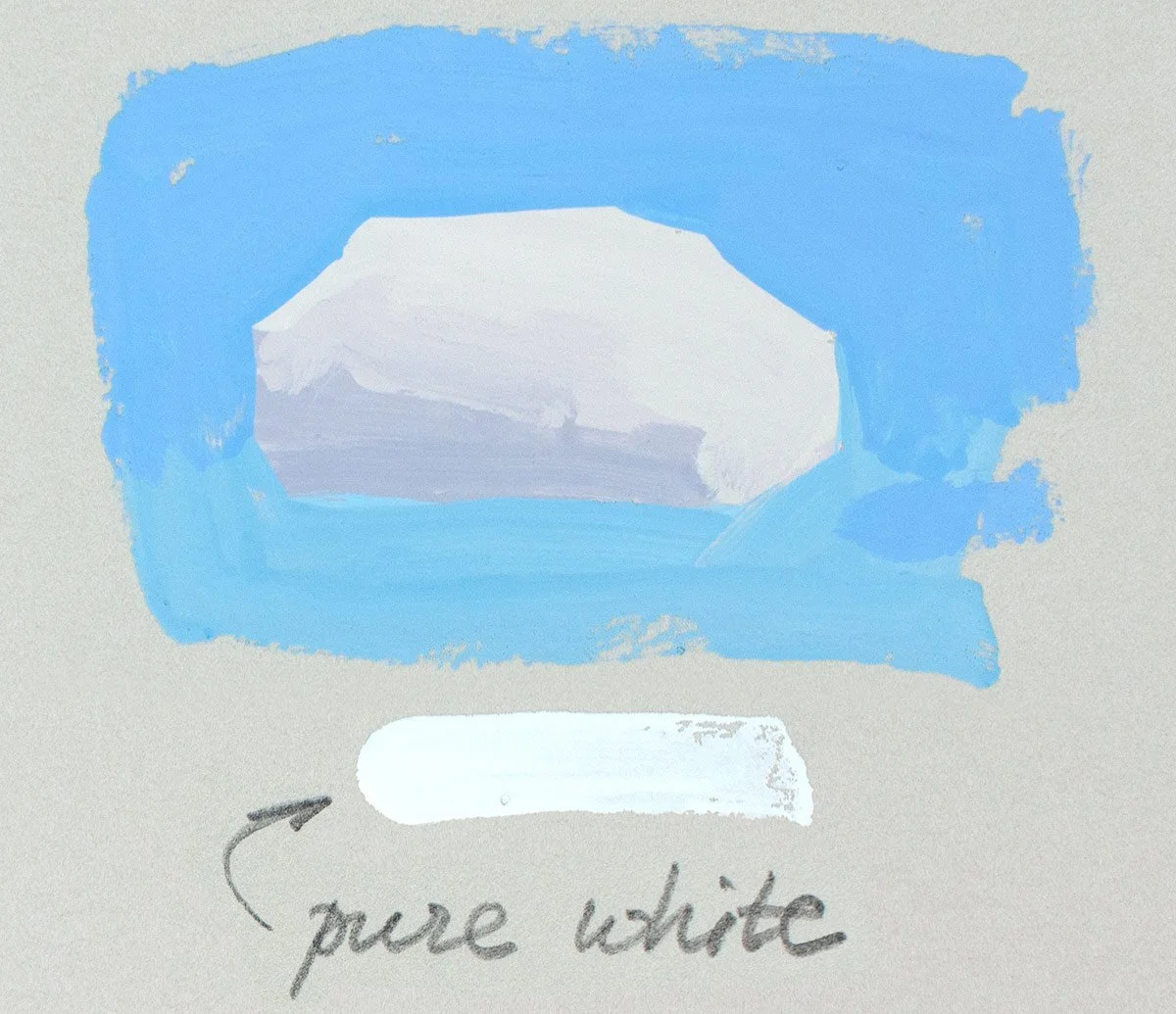 Here is a cloud I painted, using the three gray colors from the swatches above. I placed a pure white brushstroke under the cloud so that you can see that the cloud is much darker than the pure white paint, yet it looks white when surrounded by the blue color of the sky.