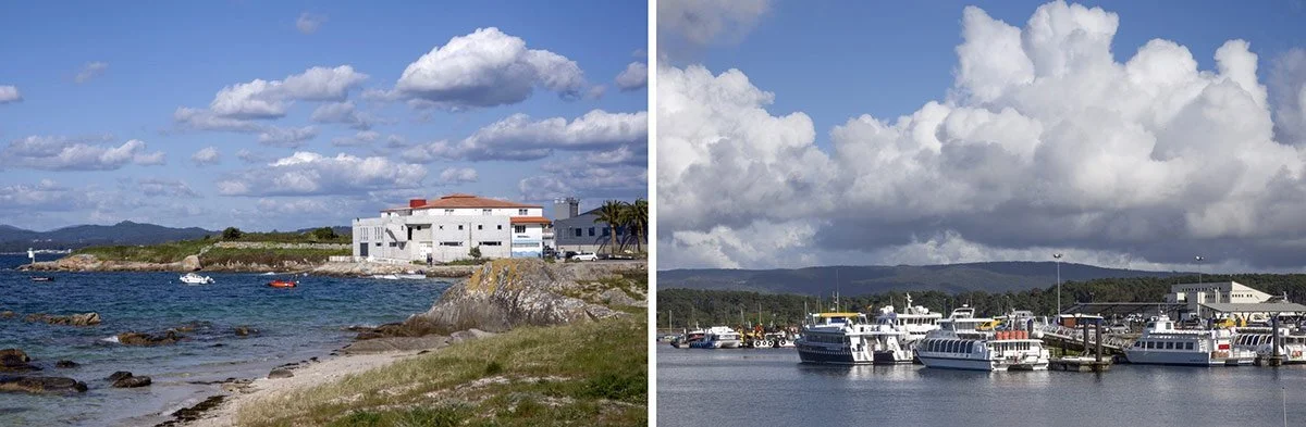 In the photo on the left, the white part of the building and the white boat are much lighter than the clouds in the sky.