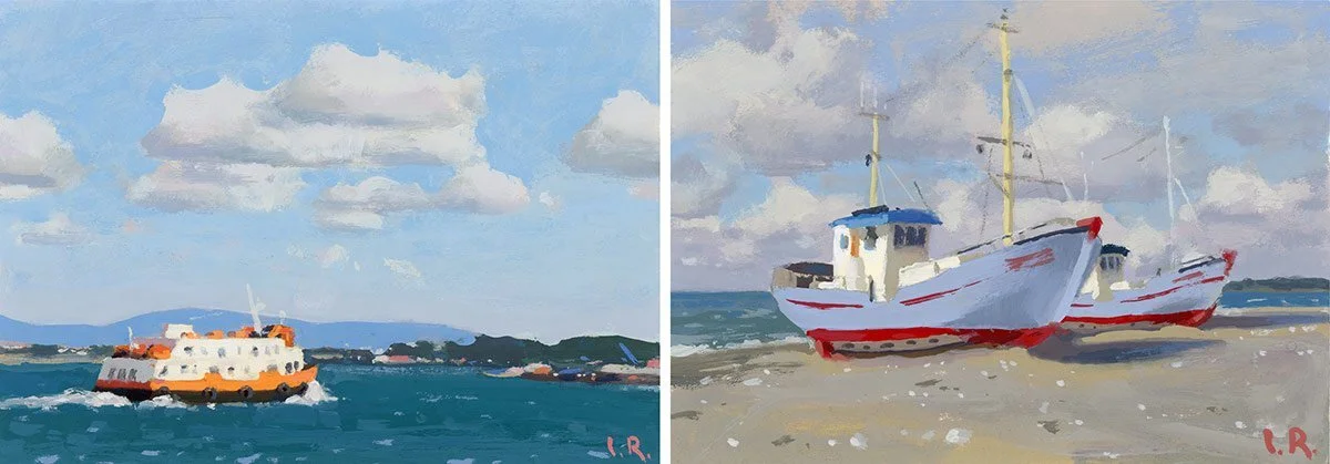 Here are a couple more paintings in which I painted the clouds slightly darker than the white foreground objects. In both of these paintings, pure white with a speck of cadmium yellow was used only on the boats, the main focal points. All the clouds were painted with light gray colors to make them recede into the picture.