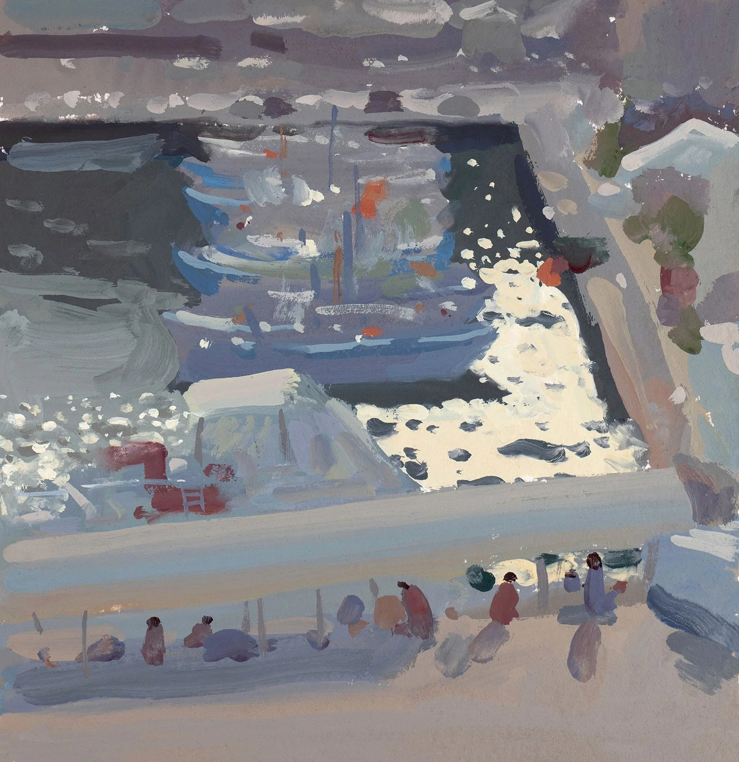 The scene captured in the next painting didn’t have any pure colors because everything was veiled in the morning haze, and most objects were in shadow. Yet, I was still able to include all the colors of the visible spectrum by using subtle, grayish versions of them. You can see yellow in the shimmering water, orange in the sunlit ground, blue and purple in the shadows, red in the people’s clothing and on some of the boats, and green in the water and the plants on the right.