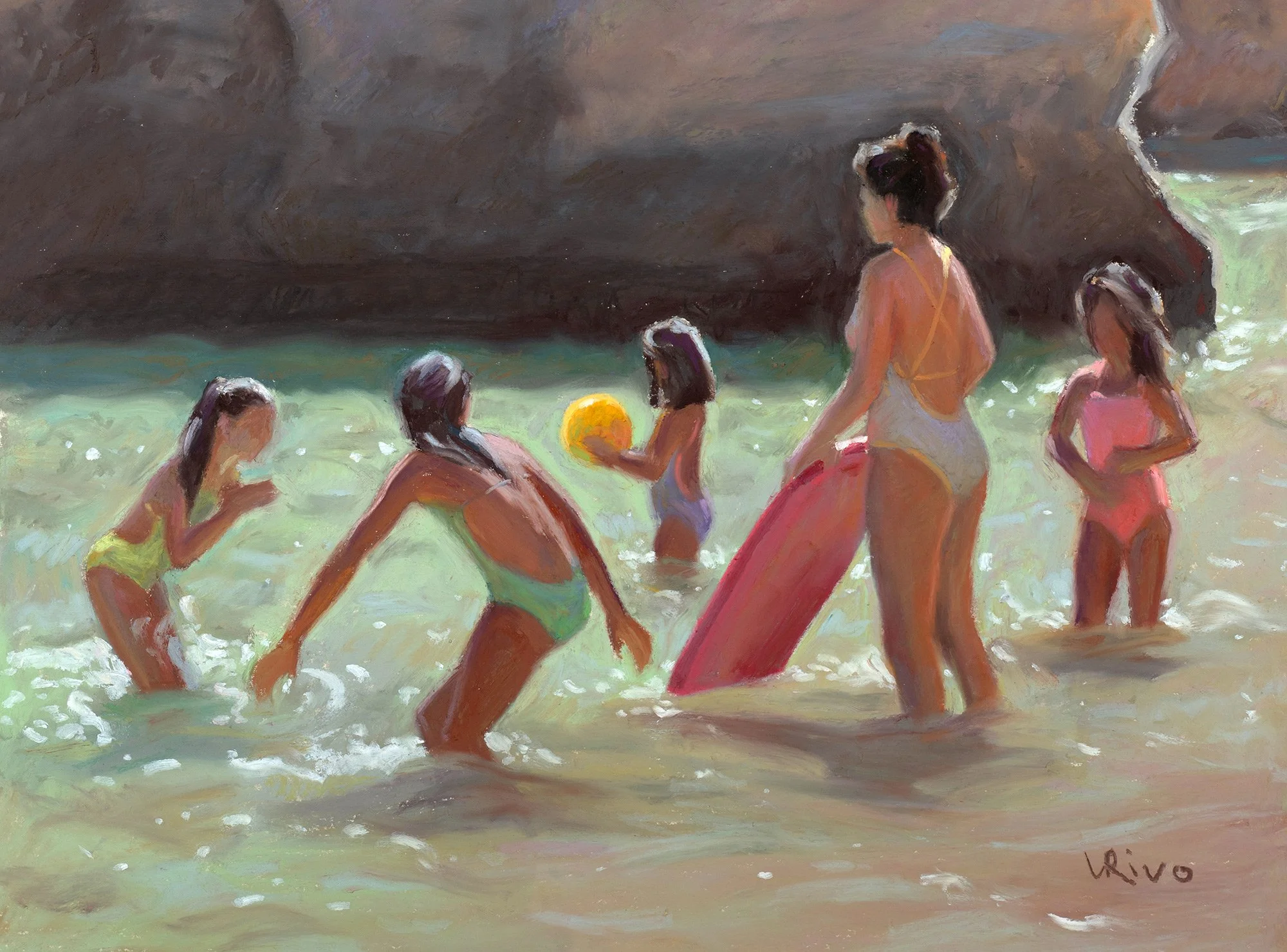 I did the same thing in this painting of a family on the beach. Try covering the woman’s green swimsuit with your finger—you’ll immediately notice how the piece appears too warm without that blue-green balancing the warm hues. If you cover the baby’s yellow swimsuit, the painting will lose its vibrancy. This demonstrates how incorporating all the colors of the rainbow brings a sense of vitality to a painting.